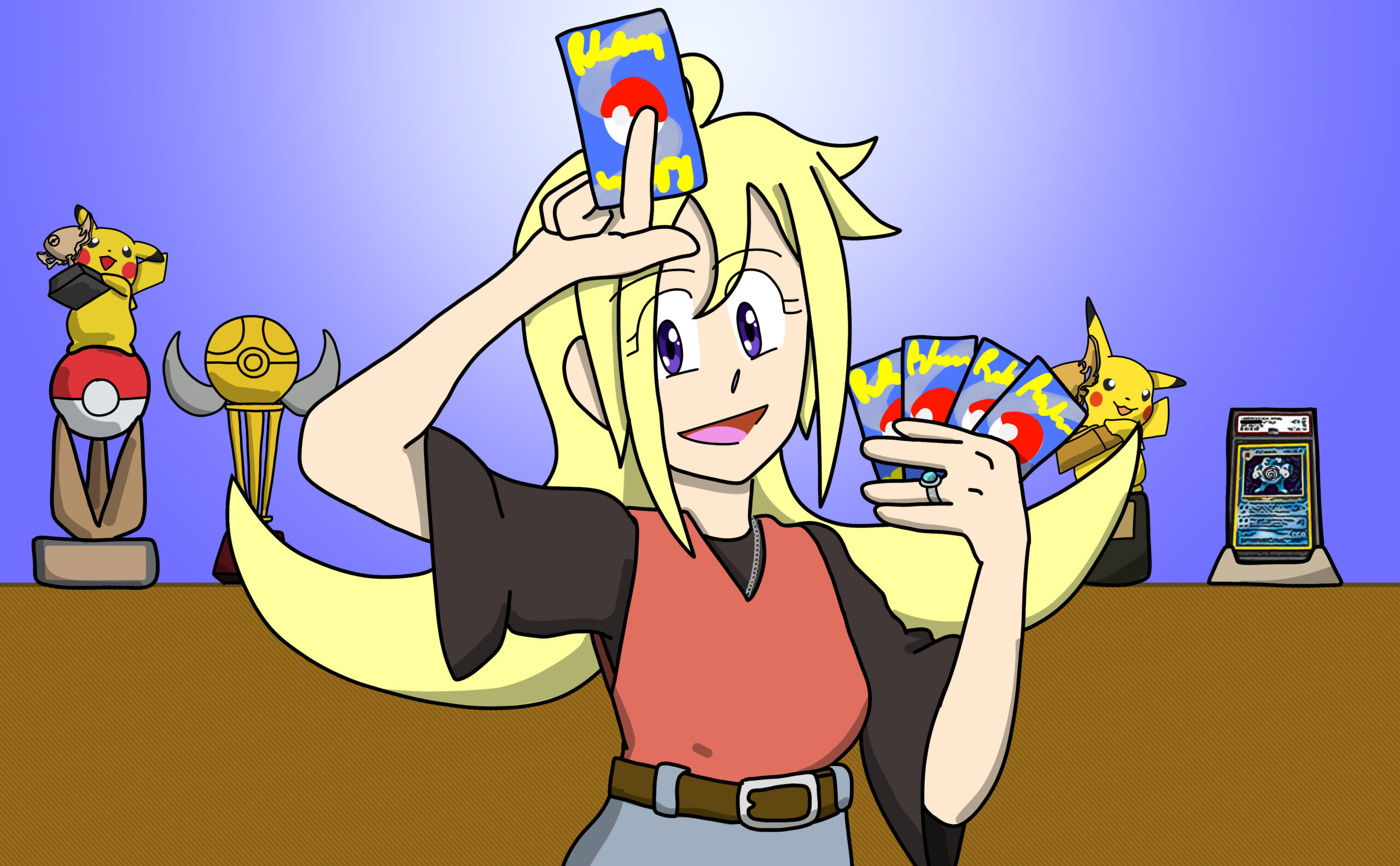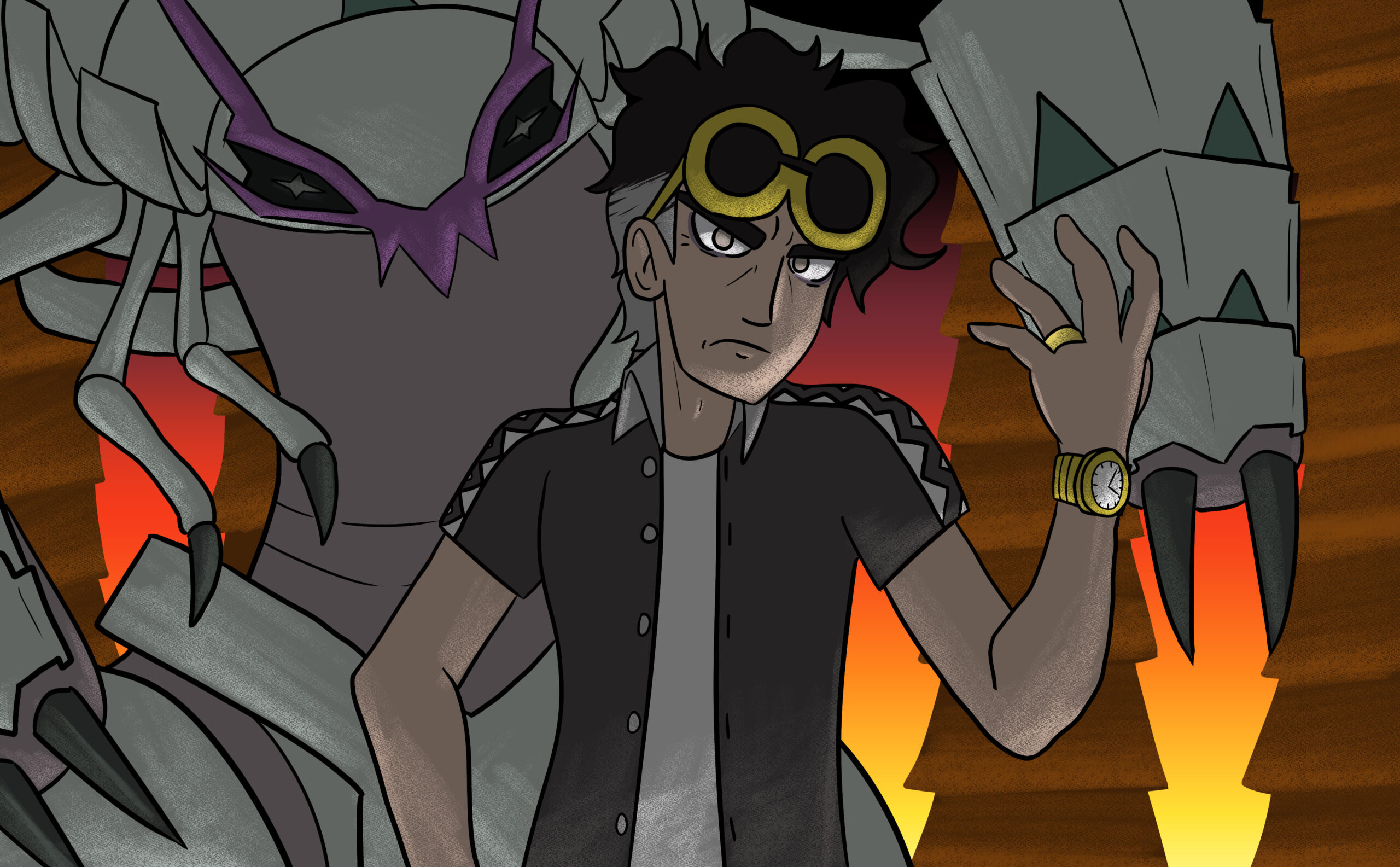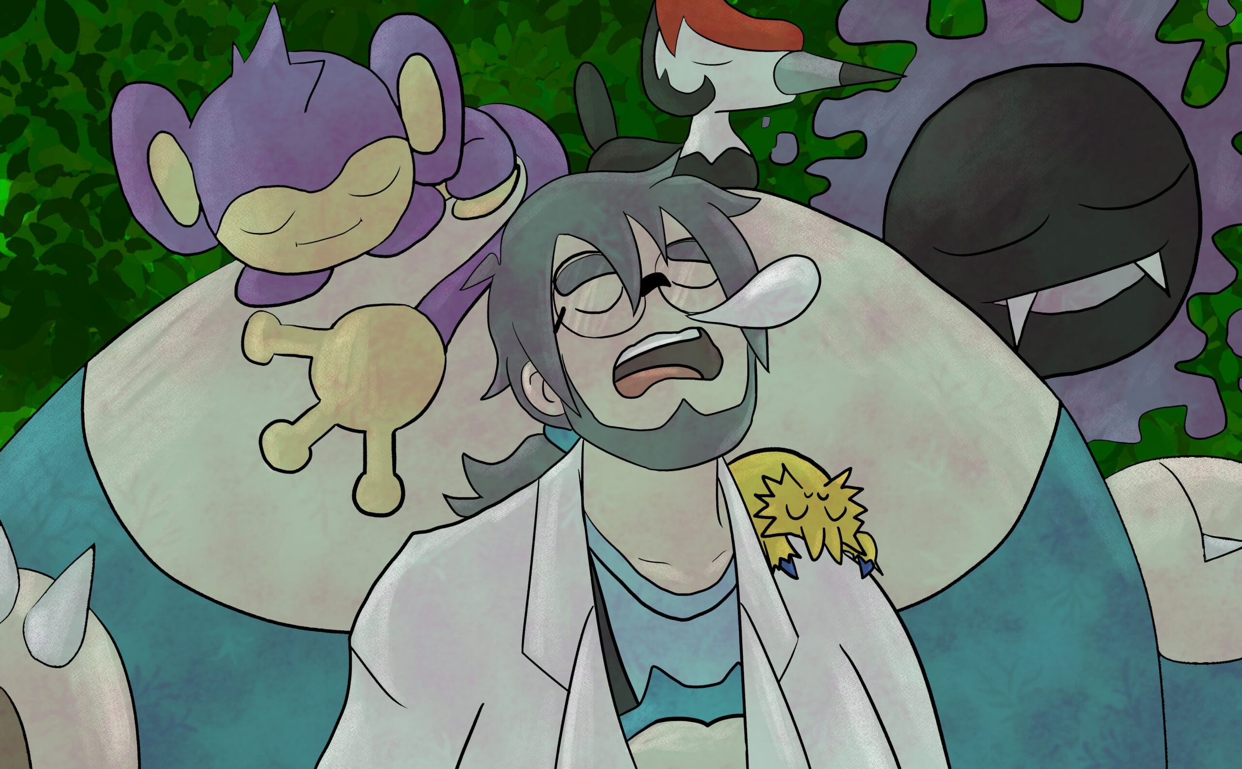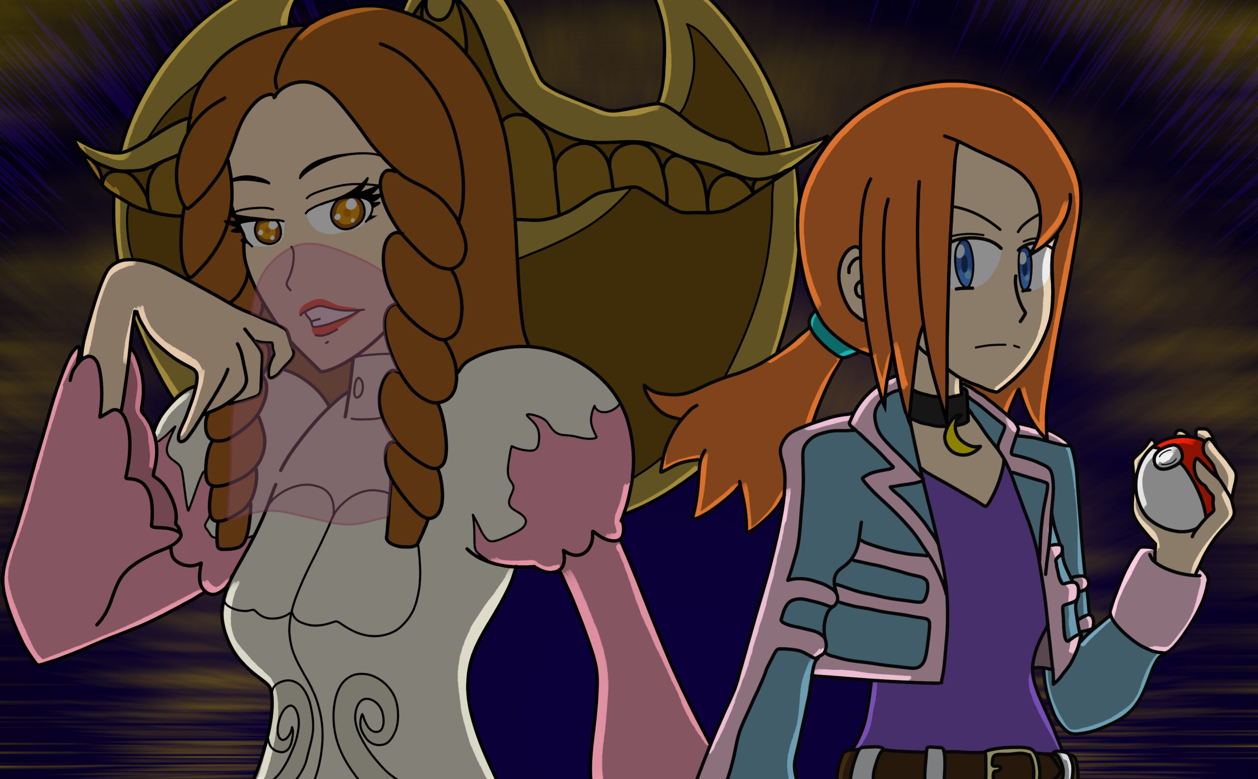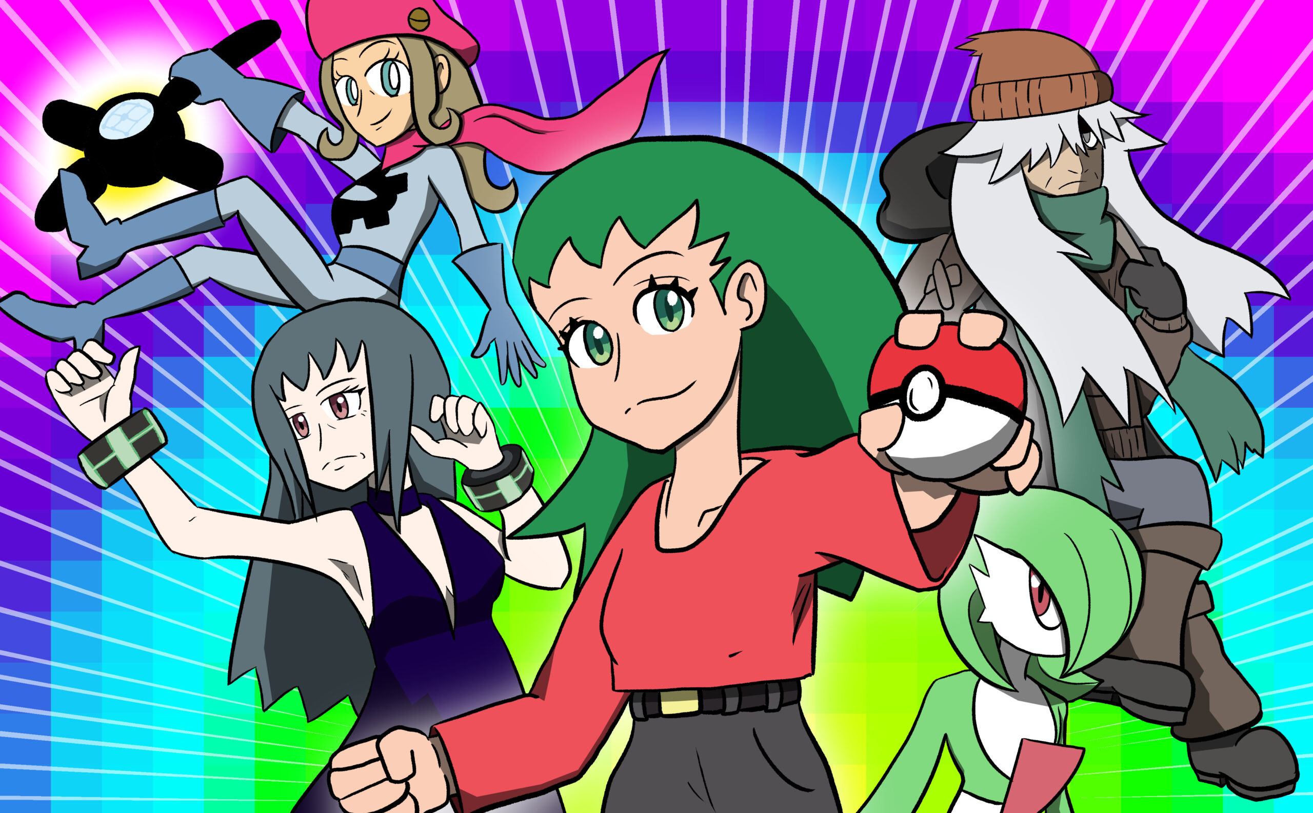 This is a set of art I did for PMJ’s Custom Pokémon set, Scarlet & Violet — Final Stand. It takes place in the future where the world is faced with Dark and Light Pokémon. I was tasked with doing the art for its supporters and custom Dark and Light Pokémon evolutions, so many of the characters are aged up accordingly (about 10-20 years).